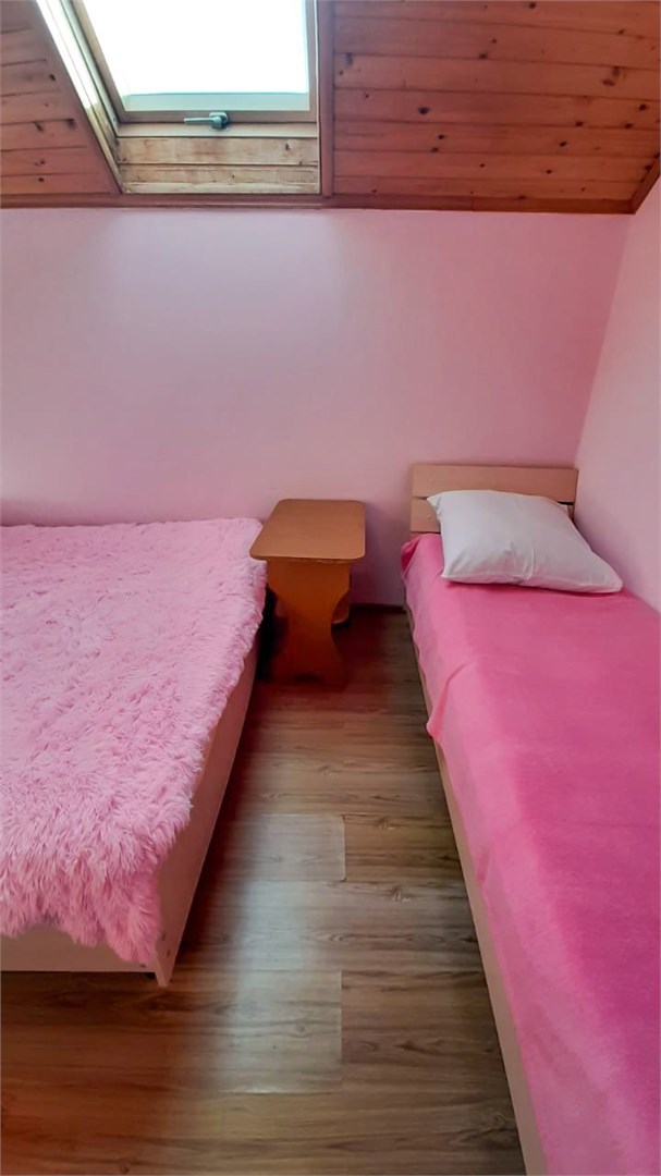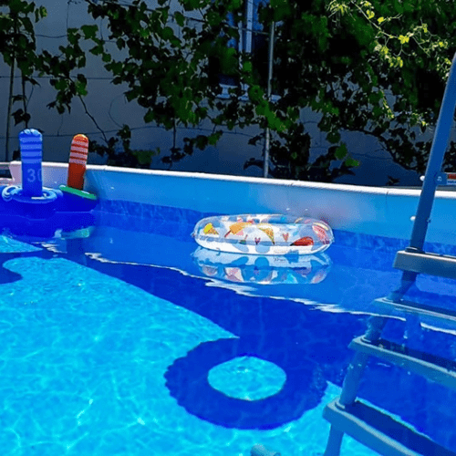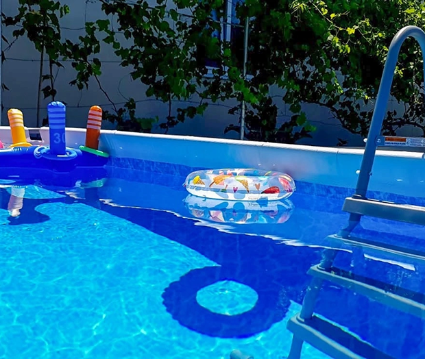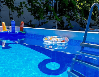На территории есть мангальная зона, общая кухня, детская площадка и каркасный бассейн. Поужинать можно в кафе неподалеку, а купить продукты — в ближайшем магазине.